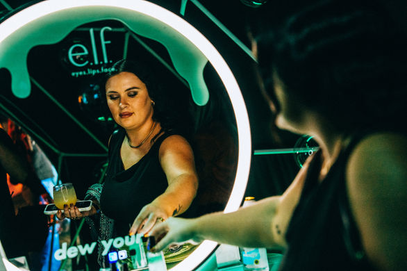 NYLON House guests were able to trial these hero products to elevate their festival looks as well as take content from all angles in our 360 degree activated dome. An eight foot wide mirror allowed for fun, shareable selfie moments while a misty backdrop with an LED neon hero logo and a gooey backdrop with tiered seating inspired creative group and solo content capture. Guests were able to take home a little piece of the Dew Dome with a giveaway bag that included e.l.f. products.